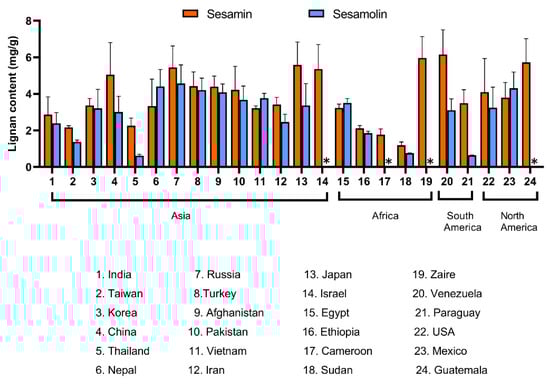Figure 8 shows the content of sesamin and sesamolin as reported for varieties and accessions from three continents. The source data and references for this overview are provided in Supplementary Information. The overview confirms a positive correlation between the content of sesamin and sesamolin. No relationship between the geographical origin and lignan content is apparent, which was expected because sesame is an old crop with a long history of seeds trade [,].