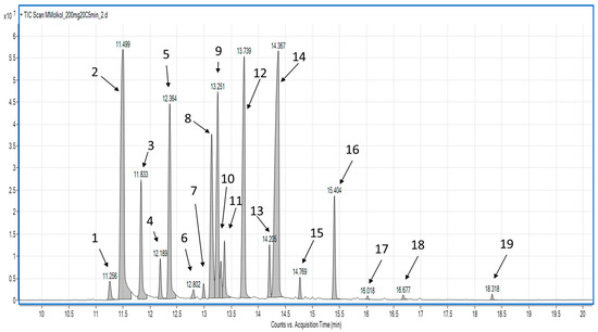 TIC chromatogram of main volatile terpenes obtained using vacuum-assisted sorbent extraction (VASE) at 20 °C. (1) α-thujene; (2) α-pinene; (3) camphene; (4) sabinene; (5) β-pinene; (6) α-phellandrene; (7) α-terpinene; (8) o-cymene; (9) sylvestrene; (10) unknown; (11) cis-ocimene; (12) γ-terpinene; (13) terpinolene; (14) β-linalool; (15) allo-ocimene; (16) camphor; (17) unknown; (18) geraniol; (19) geranyl acetate.
