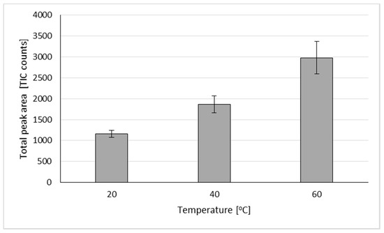 In the first step, an optimal sample size was chosen after analysis of 2000 mg, 1000 mg, and 200 mg samples. Analyses were initially run for 20 min at the temperature of 60 °C for various sample sizes. Chromatograms illustrating extraction parameters are shown in the supplementary files (Figures S1–S3). From the initial conditions, a sample size of 200 mg was chosen for further experiments (Figure S1). Decreasing further sample sizes may result in worse repeatability and reproducibility. In the next step, the temperature of extraction was checked, and from the initial ones tested (60 °C, 40 °C, and 20 °C), the last one was chosen, based on the quality of chromatograms (Figure S2). The choice of temperature is highly dependent on the compounds (which are subjects of extraction). The coriander terpenes consisted mainly of monoterpene hydrocarbons, as well as monoterpene alcohols, among which, linalool dominated. As can be seen in Figure 2, temperature had a significant effect on the extraction of analyzed terpenes from coriander oil. The total peak area was almost three times higher for 60 °C compared to 20 °C. The most significant difference, in terms of compound identification, was noted for two compounds with very low volatility—geraniol and geranyl acetate. Their peak areas were approximately four times bigger for 60 °C extraction compared to 20 °C extraction (Table 1).
