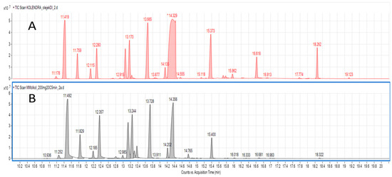 TIC chromatograms of coriander terpenes obtained after hydrodistillation of coriander cold pressed oil (A) and after VASE extraction (B).