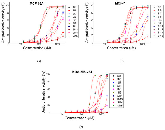 The compounds were studied for antiproliferative activity by standard MTT dye reduction assay. Cell cultures from different cell line types (MCF-10A, MCF-7 and MDA-MB-231) were incubated with the test substances at a concentration of 15 to 2000 μM for 72 h. The antiproliferative activity expressed in % relative to the negative control was determined. The obtained results are shown on Figure 2. The IC50 values of the mean were calculated and presented in Table 2. MCF-10A is a reliable model for normal human mammary epithelial cells, which serves as a control in experiments to determine antitumor activity. The IC50 values, found in MCF-10A, are used to calculate a selective index (SI), which assesses the potential of a substance to be used as an antitumor agent. We used the following formula to calculate the selective index SI = IC50 of MCF-10A / IC50 of tumor cells. The highest selective index with respect to MCF-7 is shown by the substances: Si3 (SI = 8.35), Si11 (SI = 2.62) and Si1 (SI = 1.24). The calculated selective index in the positive control (Cisplatin) is 2.36. With respect to MDA-MB-231, SI < 1 was observed for any of the test substances. The widely used in clinical practice cytostatic Cisplatin (positive control) showed SI = 25.