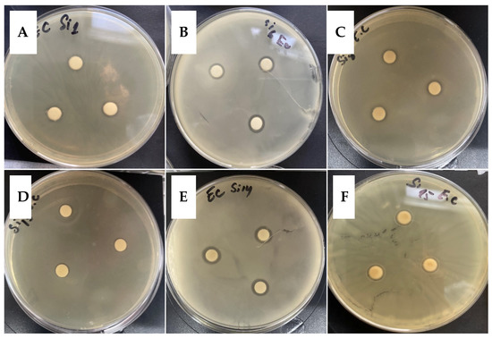 Antibacterial activity measured by the agar disk-diffusion method against E. coli K12 407 as test microorganisms for: Si1 (A), Si6 (B), Si8 (C), Si13 (D), Si14 (E), Si15 (F).
