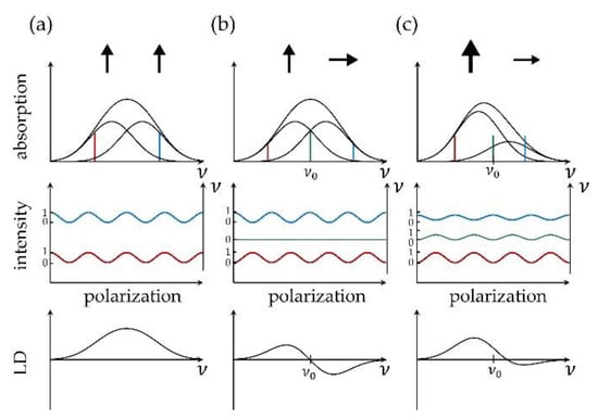 where and refer to the absorption spectra recorded for light that is linearly polarized parallel and perpendicular with respect to a reference direction. Obviously, the LD spectrum vanishes for a sample that consists of an ensemble of randomly oriented absorbers. Hence, measuring an LD spectrum requires a sample that features at least some degree of anisotropy for the orientation of its absorbers. This concept is illustrated in Figure 1. Consider a perfectly oriented sample with a broad, spectrally poorly resolved absorption band that is composed of two contributions from two electronic transitions with different transition energies but with transition-dipole moments of equal magnitude that are aligned parallel with respect to each other, Figure 1a top. Recording the absorption spectrum as a function of the linear polarization of the incident light for various excitation frequencies ν across the band yields a modulation of the absorption strength . Here, refers to the angle between the projection of the transition-dipole moment of the corresponding transition on the plane perpendicular to the propagation of the incident light and the direction of the polarization of the electric field vector. Assigning to the maximum and to the minimum of the modulation results in an LD spectrum that reproduces the absorption spectrum.