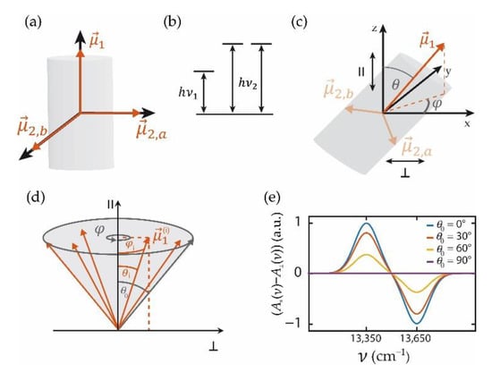 (a) Mutual orientation of the transition-dipole moments with non-vanishing oscillator strengths for a molecular aggregate with a monomer arrangement in cylindrical symmetry. (b) Excitation energies of the exciton states associated with the dipole-allowed transitions. (c) Relative orientation of the transition-dipole moment specified by the angles and with respect to a cartesian reference frame that defines the central alignment direction “parallel” () along the z-axis. (d) Schematic sketch of the relative orientations of an ensemble of tubular aggregates, if the angle between the transition-dipole moment and the z-axis is allowed to vary within a cone of opening angle . (e) Calculated ensemble LD spectrum for cylindrical aggregates with a uniform distribution of the orientation within a cone with opening angle using Equation (13). For the calculation, the magnitudes of the transition-dipole moments were put on the same level, and the transitions were modelled as Gaussians with a width of 100 cm−1 positioned at = 13,350 cm−1 for the transition associated with and = 13,650 cm−1 for the transitions associated with .