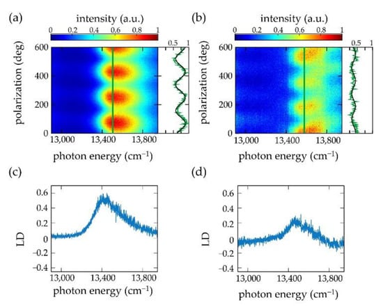 In a conventional LD experiment the chlorosomes feature a macroscopic preferential alignment that has been induced by an external procedure, for example using squeezing techniques, or involving electric or magnetic fields [41,42]. In order to define an alignment direction for reconstructing LD spectra from the polarization-resolved fluorescence-excitation spectra, we determined the modulation of the fluorescence as a function of the polarization at the spectral peak position, , of the polarization-averaged spectrum of the particular single chlorosome. This is illustrated in Figure 3 for two individual chlorosomes from the bchR mutant of the species Chlorobaculum (Cba.) tepidum. Figure 3a,b shows two examples of 200 consecutively recorded polarization-resolved fluorescence-excitation spectra in a two-dimensional representation. The horizontal axes correspond to the excitation energy, the vertical axes correspond to the polarization of the incident radiation, and the resulting fluorescence intensity is given by the colour code. Between the recordings of two subsequent spectra the linear polarization of the excitation light was rotated by 3°. The vertical green line refers to the position, , of the respective maximum of the polarization averaged intensity, and the intensity modulation at this position as a function of the polarization is shown next to the pattern. Then, the angle (modulo 180°) for which this modulation featured a maximum was defined as the central alignment direction (“parallel”, ). For the examples shown in Figure 3a,b this yields = 69.7° (modulo 180°), and 11.2° (modulo 180°), respectively. The corresponding is then obtained by adding 90° to these angles. For obtaining the LD spectrum, (), the contributions from all individual excitation spectra registered for polarizations + n⋅180° and + n⋅180° (n integer) were averaged and subtracted from each other, Figure 3c,d. This protocol relies on the assumption that the incorporation of the secondary structural elements into the individual chlorosomes follows roughly the same overall organizational scheme. This is supported by data from cryo-electron microscopy [4,7], where it appears that the tubular structures are typically aligned along the long direction of the chlorosomes, which is also in line with the observation of the strong modulations of the fluorescence intensity as a function of the polarization [12,23,28,29,43,44]. As will be shown below the presence of such an organization is consistent with our analysis for the mutants and to a lesser extent for the WT.