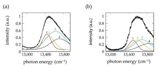 (a,b) Decomposition of the polarization-resolved fluorescence-excitation spectra from Figure 3 into four Gaussians 1 to 4 shown in yellow, red, cyan and dark blue, together with the spectrum averaged over all polarizations (black). The data have been taken from [43].