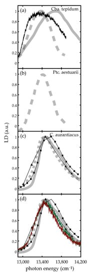 - Furumaki, S.; Vacha, F.; Habuchi, S.; Tsukatani, Y.; Bryant, D.A.; Vacha, M. Absorption linear dichroism measured directly on a single light-harvesting system: The role of disorder in chlorosomes of green photosynthetic bacteria. J. Am. Chem. Soc. 2011, 133, 6703–6710. [Google Scholar] [CrossRef]
