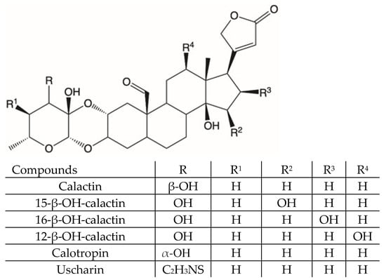 - Seiber, J.N.; JN, S.; CJ, N. Cardenolides in the latex and leaves of seven Asclepias species and Calotropis procera. Phytochemistry 1982, 21, 2343–2348. [Google Scholar] [CrossRef]