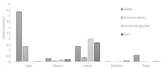 - Shaker, K.H.; Morsy, N.; Zinecker, H.; Imhoff, J.F.; Schneider, B. Secondary metabolites from Calotropis procera (Aiton). Phytochem. Lett. 2010, 3, 212–216. [Google Scholar] [CrossRef]