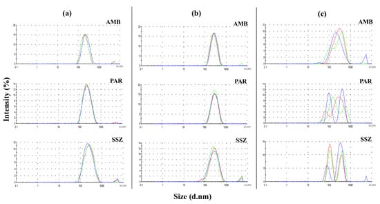 NTA (nanoparticle tracking analysis) size distribution by intensity graphs for fresh (a) AMB-SLNs (solid lipid nanoparticles), (b) PAR-SLNs, and (c) SSZ-SLNs (n = 3).