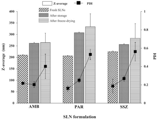 z-Average diameters and PDIs (polydispersity indexes) of freshly prepared, stored (for 24 months), and lyophilized AMB-SLNs, PAR-SLNs, and SSZ-SLNs (n = 3).
