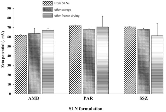 ZPs (zeta potentials) of freshly prepared, stored (24 months), and lyophilized AMB-SLNs, PAR-SLNs, and SSZ-SLNs (n = 3).