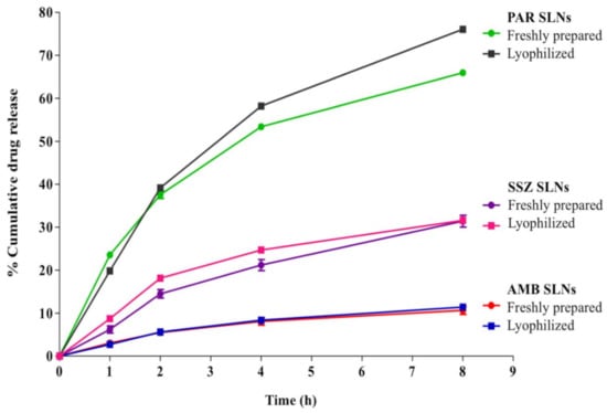 Cumulative drug release from freshly prepared and lyophilized AMB-SLNs, PAR-SLNs, and SSZ-SLNs in PBS (phosphate-buffered saline; pH 7.4).