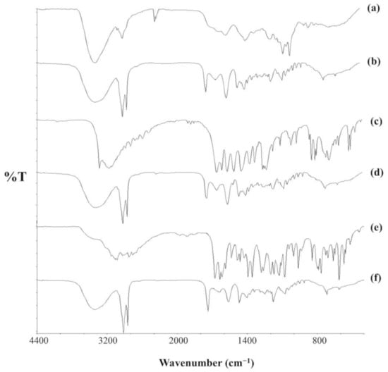FTIR (Fourier-transform infrared spectroscopy) spectra for (a,b) AMB, (c,d) PAR, and (e,f) SSZ. (a,c,e) Pure drugs. (b,d,f) SLNs.