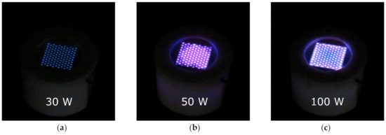 - Homola, T.; Krumpolec, R.; Zemánek, M.; Kelar, J.; Synek, P.; Hoder, T.; Černák, M. An Array of Micro-hollow Surface Dielectric Barrier Discharges for Large-Area Atmospheric-Pressure Surface Treatments. Plasma Chem. Plasma Process. 2017, 37, 1149–1163. [Google Scholar] [CrossRef]