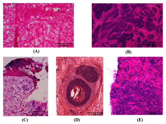 Hematoxylin and eosin (H&E) staining of samples of healthy breast tissue (A), solid papillary carcinoma (B), mucinous carcinoma (C), ductal carcinoma in situ (D), and invasive ductal carcinoma (E); scale bars: 1050 µm, 1050 µm, 1050 µm, 400 µm and 1050 µm, respectively.