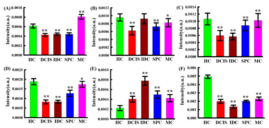 Bar graphs showing variations in the intensity of spectral peak corresponding to various biochemical components in HC, IDC, DCIS, SPC, and MC samples. The mean ± standard deviation is indicated. (A) Collagen (868 cm−1), (B) lipid (1267 cm−1), (C) lipid (1302 cm−1), (D) lipid (1440 cm−1), (E) protein (1608 cm−1), (F) lipid (2890 cm−1). Statistical signifificance was determined by one-way ANOVA followed by a Tukey’s HSD post-hoc test. Asterisks indicate levels of signifificance, * p < 0.05, ** p < 0.01.