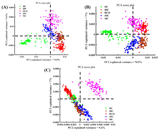 The Raman spectra of the five tissue types related to the low-wavenumber region (600–1800 cm−1) and the high-wavenumber region (2800–3000 cm−1) were considered and categorized by PCA to obtain corresponding PC scores and loading values. The first PC accounted for the largest variance within the spectral dataset (PC1, 74.9%), while PC2 and PC3 represented 9.4% and 7% of the total variance, respectively. The scatter plot of PC1 and PC2 shown in Figure 4A revealed a clear separation between cancerous tissues and healthy breast tissue. Basically, the spectra on the positive axis of PC1 chiefly belonged to cancerous tissue, whereas spectra of the healthy tissue were mostly located on the negative axis. It appeared that the zero line of PC1 could mainly be used to distinguish healthy tissue from cancer tissue. Similarly, the scatter plots of PC1 and PC3, as well as of PC2 and PC3 could also be used to distinguish different types of breast tissue, as shown in Figure 4B,C. The spectra on the positive axis of PC2 mainly belonged to the SPC and MC samples, while the spectra of the HC, DCIS, and IDC samples were mainly located on the negative axis. Most of the spectra of the DCIS group were located on the positive axis of PC3, while most of the spectra of the IDC group were distributed on the negative axis.