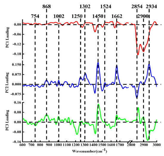 Moreover, we found that PCA not only was able to distinguish the spectra of different tissues, but also had the potential to derive molecular feature information related to tissue classification, depending on the corresponding loading spectra of each PC [36]. A clear spectral variability was observed, and moreover the loadings could be compared to pristine Raman spectra. The loadings of PC1, PC2, and PC3 are shown in Figure 5. The loading of PC1 was basically below the zero line, with obvious peak positions in the loading at 1267, 2860, 2900 cm−1, which can be attributed to the characteristic bands of lipid components. Compared with the single spectrum of Figure 2, the features of the PC1 loading appeared extremely similar to the spectral characteristics of healthy breast tissue, suggesting that PC1 can be used primarily to differentiate healthy tissue from cancer tissue. This is consistent with the distribution of the spectra of healthy breast tissue shown in the scatter plot of Figure 4A,B. The positive peaks in the spectral loading of PC2 were attributed to biochemical components such as protein at 868 and 1250 cm−1, phenylalanine at 1002 cm−1, lipids at 1302, 1450, 1662, and 2940 cm−1, and carotenoid at 1524 cm−1 [37], while the negative peaks were attributed to lipids at 2854 cm−1. The loading of PC2 with the characteristic spectrum of cancerous tissue (MC) revealed marked similarities between the two groups of spectra. These observations indicate that the features of PC2 extraction were derived mainly from the MC samples.