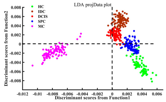 The first three PC scores were used as input variables for LDA to establish a final diagnostic model. Figure 6 demonstrates the linear discriminant scores of all obtained spectral data in both fingerprint (600–1800 cm−1) and high-wavenumber range (2800–3000 cm−1) from the investigated samples obtained by the PCA–LDA algorithm. The scatter plot of the LDA discriminant scores shows that the spectra of MC tissue were mainly distributed on the negative axis of the first discriminant function, while the spectra of breast tissue from other experimental groups were mainly distributed on the positive axis. The spectra of DCIS and IDC were mainly on the positive axis of the second linear discriminant score, whereas the spectra of the HC group were mainly observed on the negative axis, and those of the SPC samples were evenly distributed on both sides of the zero line.