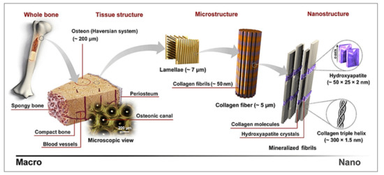 Hierarchical structure of bone from macro to nano scale. The composition and structure of bone tissue at different length scales are essential for bone health and function. Image source: Sadat-Shojai et al. [19].