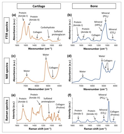 Typical vibrational spectra of cartilage and bone. (a) FTIR spectra of cartilage, (b) FTIR spectra of bone, (c) NIR spectra of cartilage, (d) NIR spectra of bone, (e) Raman spectra of cartilage, (f) Raman spectra of bone.