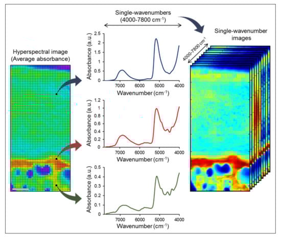 Schematic of hyperspectral image. Each pixel of the spectral image corresponds to an individual spatially-defined spectrum, from which specific features can be extracted to generate multiple compositional maps. The figure illustrates a NIR hyperspectral image of an osteochondral tissue section, in which the intensity of absorbance bands at single-wavenumber frequencies are used to create several images to map the distribution of specific components. Scale bar: 500 μm. Image source: Afara et al. [32].