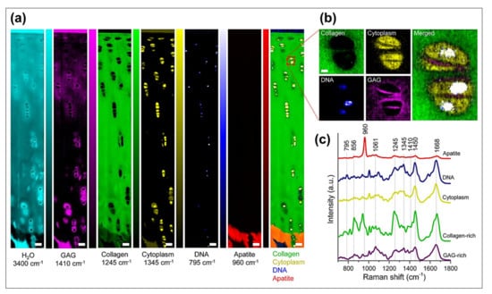 Raman spectroscopic imaging of articular cartilage and the underlying calcified zone. Univariate Raman spectroscopic mapping of articular cartilage based on the band intensity of (a) Water (3400 cm−1), GAG (1410 cm−1), Collagen (1245 cm−1), Cytoplasm (1345 cm−1), DNA (795 cm−1), Apatite (960 cm−1) and combined. (b) High resolution Raman spectroscopy image of chondrocytes and periceulluar matrix based on collagen, DNA, Cytoplasm, GAG and combined. (c) Representative Raman spectra of these articular cartilage components. Image source: Bergholt et al. [67].
