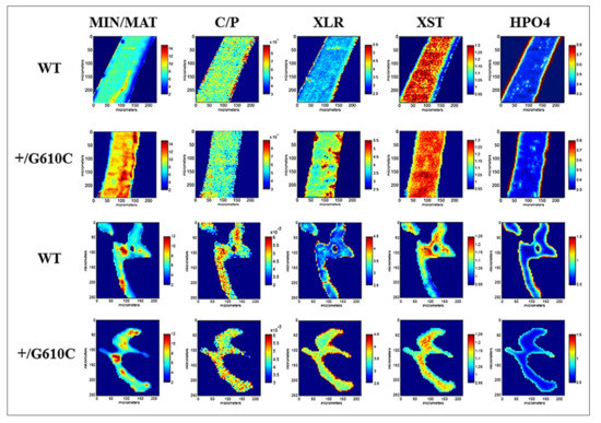 FTIR spectral imaging of cortical (top two panels) and trabecular (bottom two panels) bone from wild type (WT) and +/G610C (OI mouse model) mice. Spectral analysis allowed mapping several compositional parameters of the tissues: mineral relative to matrix ratio (MIN/MAT), carbonate relative to phosphate ratio (C/P), collagen maturity (XLR), mineral crystallinity (XST) and content of HPO42− substitutions in the mineral (HPO4). Image source: Masci et al. [77].