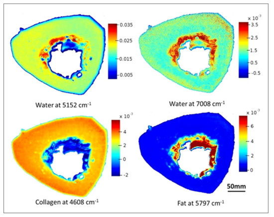 NIR spectral imaging has also been applied to assess bone composition, providing valuable information on the content and distribution of tissue water and collagen. In an important study, Rajapakse et al. [49] used NIR imaging to evaluate whole cross-sections of cadaveric human tibia. Interestingly, it was possible to image sections with 450 µm in thickness, illustrating the ability of this approach to evaluate thick samples with minimal preparation. Using absorbance bands associated with different ECM components, they were able to obtain images showing the distribution of water and collagen throughout whole bone sections with micron spatial resolution (Figure 8). Additionally, they also used a lipid absorbance band to show the distribution of bone marrow fat at the endosteal surface of the sections. These images represent an important step forward into the application of NIR spectroscopy to assess bone composition at the tissue level. Another interesting finding of this study was that the quantification of water absorbance bands in the NIR spectra correlated well with tissue bound-water content determined by magnetic resonance imaging (MRI), strengthening the application of NIR spectroscopy to reliably assess bone tissue water. Additionally, the intensity of NIR water absorbance bands was later showed to strongly correlate also to gravimetric water content, which is the standard method to quantify water content in tissues. In a subsequent study, Hong et al. [59] further showed a negative correlation between the distribution of bone water and collagen determined by NIR spectral imaging and the porosity index of cortical bone determined by MRI. Moreover, they showed that combining NIR compositional parameters to the porosity index values could potentially contribute to the performance of multivariate regression models to predict bone stiffness. This is an interesting preliminary finding, which encourages research into whether incorporating parameters obtained by NIR spectroscopy into current bone fracture prediction models could improve their accuracy.
