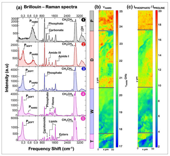 Correlative Brillouin–Raman microspectroscopy. P: periosteal sheath, D: cortical region, W: transition region, and T: trabecular region. From the periosteal surface to the trabecular bone (a, top to bottom), note in the Brillouin spectra a decrease in the amount of hard components and increase in soft components. This is followed by a reduction in mineral (phosphate, carbonate) and protein (amide I, amide III) Raman bands and increase in those of lipid and blood (heme). The Brillouin image (b) showing the distribution of hard components has a strong spatial correlation with the Raman image (c) of the distribution of tissue mineralization (R = 0.78). Image source: Cardinali et al. [154].