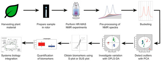 High-resolution magic angle spinning NMR is a powerful tool to obtain the metabolic profile directly from plant material. The major advantage of HR-MAS NMR over liquid-state NMR is that there is no extraction step necessary which can lead to the loss of signals from non-soluble metabolites. It is a non-destructive method, which makes it possible to use the samples for other experiments such as transcriptomics analysis [79,80]. The pre-processing steps of the one-dimensional HR-MAS NMR spectra need to be done carefully. Combined with multivariate analysis, HR-MAS NMR-based metabolomics is a powerful tool to investigate plants. It is possible to link the gene regulatory network and functional physical structure, which is considered as highly complex.
