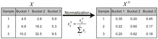 Every data point in the hypothetical bucket matrix ( ) is normalised by the sum of the intensity of each sample. is an element located in the th row and the th column.