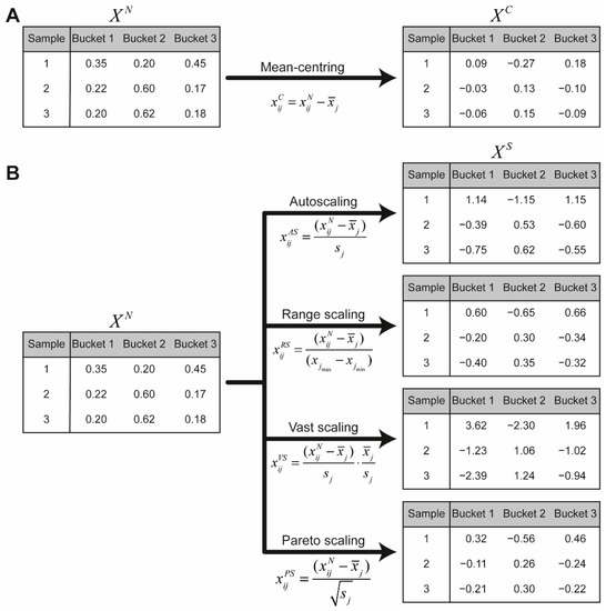 Scaling methods divide every bucket by a scaling factor. Scaling methods include autoscaling, range scaling, vast scaling and Pareto scaling [30,31]. Table 2 shows the different scaling factors for each scaling method and Figure 6 illustrates the different methods for the hypostatical example. More details about the scaling methods can be found in van den Berg et al. [30].