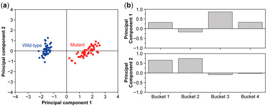 PCA score (a) and loading plot (b) of a data set including 50 wild-type samples and 50 mutant samples and 4 buckets for every sample. The score plot shows a clear separation between the wild type and mutant. The PCA loading plot shows that bucket 3 has the most influence on the first principal component and buckets 1 and 2 have the most influence on the second principal component.