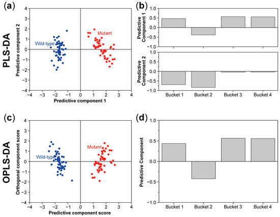 Partial least squares discriminant analysis (PLS-DA) score (a) and loading plot (b) and orthogonal partial least squares discriminant analysis (OPLS-DA) score (c) and loading plot (d) for the same data set as described in Figure 6. In both models, there is also a clear separation between the wild type and mutant in the score plots.