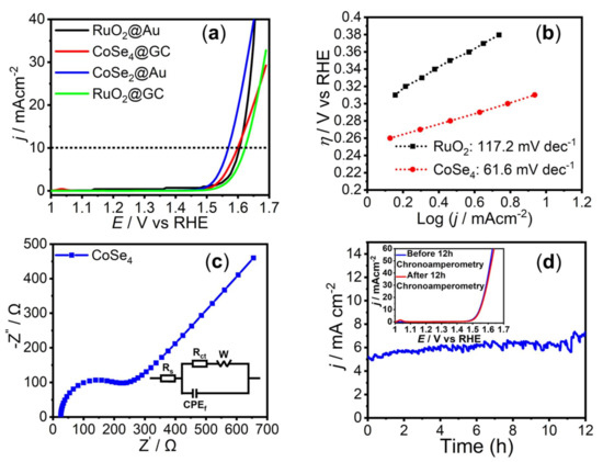 The onset potentials for CoSe4@Au-glass and RuO2@Au-glass were 1.44 and 1.51 vs. reversible hydrogen electrode (RHE), respectively, as shown in Figure 3a. The overpotential required to achieve current density of 10 mA cm−2 (considering the electrode geometric area) for CoSe4@Au-glass and RuO2@Au-glass were 320 and 380 mV, respectively (Figure 3a and Figure 4). This indicates the superiority in catalytic activity of CoSe4 compared to state-of-the-art (RuO2) OER electrocatalyst (Figure 4). Furthermore, Tafel slopes obtained from Tafel plots (η vs. log j) applying Equation (2), were used to investigate OER kinetics of the CoSe4@Au-glass and RuO2@Au-glass electrodes, as shown in Figure 3b. Tafel slopes of 61.6 and 117.2 mV dec−1 were obtained for CoSe4@Au-glass and RuO2@Au-glass, respectively. The smaller Tafel slope shown by CoSe4-modified electrodes compared to RuO2 further confirms faster kinetics for OER and consequently better electrocatalytic efficiency of CoSe4. The Tafel slope for CoSe4 is also comparable to reported values for other transition-metal–chalcogenide-based catalysts [14,24]. The CoSe4@Au-glass was also analyzed through electroimpedance spectroscopy (EIS) to estimate the charge transfer resistance (RCT) at the catalyst–electrolyte interface. The EIS spectra shown in Figure 3c could be fitted to an equivalent circuit and the RCT was estimated to be approximately 180 ohm. The low value of RCT indicates faster charge-transfer at the catalyst interface.