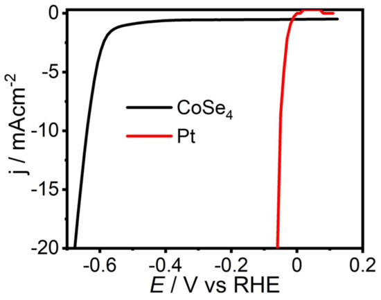 The electrocatalytic HER performance of the CoSe4 catalyst and that of the state-of-the-art Pt catalyst were also studied and compared under similar conditions (in N2-saturated 1 M KOH). In order to avoid any form of catalytic activity interference, the HER activity of CoSe4 was evaluated using GC as the counter electrode instead of Pt, since Pt could undergo anodic dissolution and redeposit onto the cathode, which would affect the activity. The LSV (Figure 7) obtained with CoSe4@Au-glass as cathode confirmed that it is active for HER and showed an onset potential of 0.52 V, which was higher than that with a Pt cathode. The cathodic current increased rapidly under more negative potentials. The overpotential for CoSe4@Au at a current density of 10 mA cm−2 was 0.63 V, which is also far from that with a Pt cathode. This shows that CoSe4 is moderately active for HER. The catalytic activity can be possibly improved by intermixing the electrocatalyst with other conducting additives such as activated carbon, graphene or carbon nanotubes as has been reported earlier for other catalysts [56,57,58].