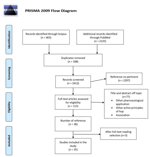 Following the Preferred Reporting Items for Systematic Reviews and Meta-Analyses (PRISMA) guidelines, the systematic search of the literature was performed in April 2020 and included all reports published to December 2020. It included the article inherent to the review’s object found on two specialized databases: Scopus and PubMed. Full-text not available were not requested and unpublished data was not pursued further. The keyword used to launch the articles were: Humulus lupulus, bitter acid, iso-humulone, and iso-α-acid, paired with the following words: metabolic syndrome, obesity, inflammation, diabetes, pharmacokinetics, clinical trial.