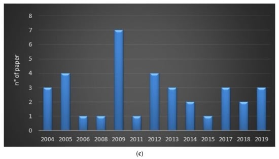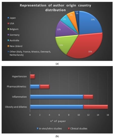The initial selection provided 2600 articles, of which 2135 were found on PubMed and 465 on Scopus. Among the 2600 items, only 303 were related to the research subject; from these 303 documents, 188 were duplicates. Out of those 115 studies, 77 were off-topic basing on the exclusion criteria, while 3 did not contain experimental data congruent with the topic. The final reference list comprises 35 items from 11 countries [USA 35%, Japan 23%, Belgium 15%, Germany 12%, Australia 6%, New Zeland 6%, Other (Italy, France, Mexico, Denmark, and the Netherlands) 3%)] (Figure 5a).