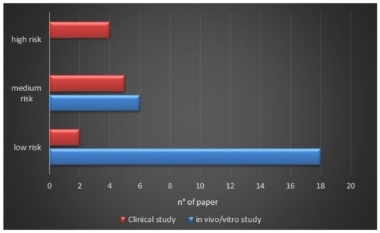 The authors assessed the quality of each investigation and the risk of bias by adapting the checklist of Cochrane Handbook for Systematic Reviews of Interventions, adjusted explicitly for animal intervention study (SYRCLE’s) [74] and clinical trials [75]. The evaluation of the studies’ qualities was done basing on the presence or absence of the information reported in Table 4 and Table 5. Studies that did not follow all the criteria were linked as articles with a medium risk of bias, while manuscript characterized by a lack of these criteria were included in the high risk of bias group. Finally, investigations that respected all parameters were assessed as having a low risk of bias.