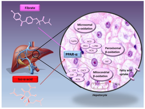 Iso-α-acids as well as Fibrate decrease fatty acid and triglycerides plasma levels by up-regulating genes involved in fatty acid up-take, microsomal ω-oxidation, peroxisomal and mitochondrial β-oxidation. These activities exerted by bitter hop compound are related to the activation of PPAR-α with a mechanism very similar to that of fibrates.