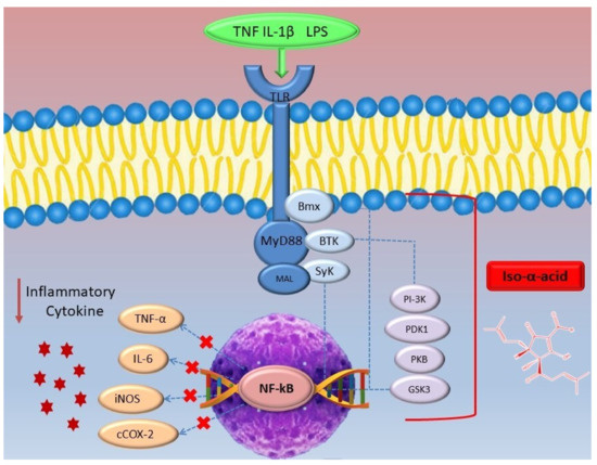 Similar to IAA, reduced iso-α-acids, such as RIAA and THIAA, have also been found to inhibit inflammatory signal transduction of NF-kB. In fact, in vitro investigations proved that both RIAA and THIAA (1–20 μg/mL) dose-dependently reduced NF-kB nuclear translocation and abundancy in lipopolysaccharide (LPS)-stimulated RAW 264.7 macrophages [50]. This activity was shown to be similar to that of parthenolide, a natural NF-κB inhibitor that works through the inhibition of NF-κB activation and releases from the cytoplasmatic IkB complex [50,51]. Furthermore, RIAA and THIAA inhibited several protein kinases involved in LPS-triggered activation of toll-like receptors (TLRs). These reduced iso-α-acids appeared to inhibit BTK and SyK, kinases involved in the phosphorylation of TLR and, consequently, in the initiation of a series of signaling cascades implicated in the activation of MAPKs and NF-kB, leading the production of pro-inflammatory cytokines [50,52]. Particularly, a study conducted on LPS-stimulated RAW 264.7 macrophages demonstrated that THIAA inhibited the activity of BTK (IC50 = 41 μg/mL), SyK (IC50 = 60 μg/mL), and Bmx (IC50 = 87 μg/mL) in up-stream LPS activated signalosome [53], a signalling complex consisting of several proteins, including adapter proteins MyD88, recruited after the activation of TLR [54]. The effect of THIAA on PI3K, PKB, PDK, and GSK3 has also been studied, as these kinases play an important role in the downstream LPS-activated signalosome, leading to the activation of NF-kB. It was seen that THIAA inhibited multiple kinases in the PI3K pathway dose-dependently (1-20 μg/mL), including all three isoforms of PI3K (β IC50 = 54 μg/mL; δ IC50 = 15 μg/mL; IC50 = 15 μg/mL), PDK1 (IC50 = 53 μg/mL), PKBβ (IC50 = 30 μg/mL), and both isoforms of GSK3 (α IC50 = 28 μg/mL; β, IC50 = 17 μg/mL) [53] (Figure 9). These findings were also confirmed by another in vitro study on hepatic stellate cells (HSC) treated with hop bitter acid extract. NF-kB is also involved in the activation of HSC, playing a key role in the development of hepatic steatosis [55]. Thus, reduced iso-α-acid inhibits multiples kinases involved upstream and downstream of the signal transduction, leading to NF-kB inactivation.