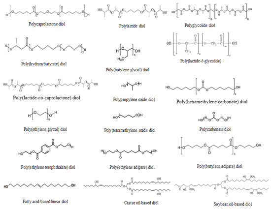 Polyurethane ionomers contain polar urethane groups that are capable of interacting via hydrogen bonds. The polyurethane ionomers have ionic groups that can aggregate and interact with each other, and attach to the hydrophobic neighborhood. With changing the molar mass of the segments, chemical structure, internal surfactants, degree of neutralization, and ratio of the soft to the hard segments, a broad range of physical and mechanical properties can be obtained. The materials can be soft and tacky, hard and brittle, or anywhere in between. Figure 1 depicts a list of different types of diisocyanates that are commonly used in the synthesis of polyurethanes for different industrial applications [40]. Aromatic and aliphatic diisocyanates have different chemical reactivities and can be used to tailor the mechanical, thermal and UV stability of polyurethanes. The aromatic diisocyanates are more reactive than the aliphatic ones and can be used in polyurethane synthesis only if their reactivities are matched with the specific polymer reaction to create desired properties in the final products. For instance, polyurethane coatings made from aromatic diisocyanates will undergo photodegradation [41], while coatings made from aliphatic isocyanates are light stable [42,43,44,45]. The soft segments of PU are commonly low molar mass (Mw = 500–5000 g/mol) dihydroxy terminated long chain macroglycols (polyols), such as polyesters, polyethers, polydienes, polyolefins, and plant oil-based polyols (see Figure 2). PU made from polyester soft segments are very sensitive to hydrolytic degradation via cleavage of the ester linkage compared to polyether-based urethanes. Polyester polyols, with alkyl side groups, such as poly(2,4-diethyl-1,5-pentamethylene adipate) glycol (PDPAd) have been developed to improve the hydrolytic stability of waterborne PUDs [46]. Polyurethanes with a polyethylene oxide (PEO) soft segment have poor water resistance and exhibited a significant level of hydrolytic degradation. Recently, a large number of biodegradable PUs were developed using biodegradable polyols, such as poly(lactic acid) (PLA), polycaprolactone (PCL), poly(glycolic acid) (PGA), poly(hydroxyalkanoates) (PHA) to create new functional materials for biomedical applications.
