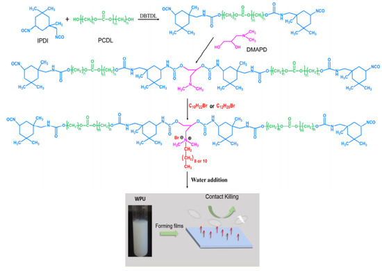 Polycarbonate diol (PCDL), IPDI, and 3-dimethylamino-1,2-propanediol (DMAPD) as the internal surfactant were used to synthesize cationic waterborne PUDs. DMAPD was reacted with 1-bromodecane and 1-bromododecane, to produce a quaternary ammonium salt and this was dispersed in water to produce cationic PUDs with nanoparticle size, high dispersion stability, and excellent antimicrobial properties [74]. Figure 5 shows the elementary steps of the synthesize process of waterborne cationic PC-based PUDs. The casted solid films showed a high efficiency in killing Gram-negative Escherichia coli and Gram-positive Staphylococcus epidermidis [74]. The longer hydrocarbon tail of this polyurethane structure provided higher antimicrobial potency due to the strong hydrophobic interactions. In addition, the authors found that the antimicrobial action of the solid films was based on contact killing, without leaching of bactericidal species, as revealed by a zone-of inhibition test [74]. Furthermore, the polyurethane films obtained from the solvent cast exhibited good mechanical properties with a tensile strength of 36 MPa and an elongation at break of 620%. The excellent antimicrobial and mechanical properties of the solid films of PC-based polyurethane might be suitable for antimicrobial coating applications [74]. The biodegradation behavior of solid PU films obtained from the solution cast of the different aqueous PUDs will be reviewed in the next section.