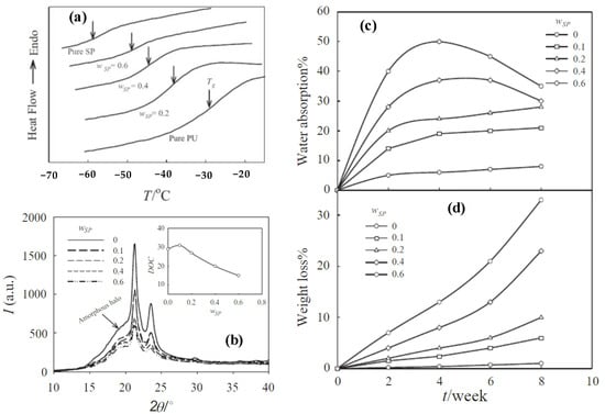 Waterborne PCL-based PUDs and soy protein (SP) were homogenously mixed in an aqueous solution to prepare hydrolytically degradable binary miscible PU/SP blends. The PU and SP were found to have miscible mixtures over the entire range of composition. As clearly seen in Figure 6a, the DSC (differential scanning calorimeter) data showed only one Tg that was shifted to a lower temperature with increasing SP content in the blend. The degree of crystallinity measured by the WAXS (wide angle x-ray scattering) increased to reach a maximum value of 10 wt.% SP and then decreased linearly with increasing the concentration of SP, as demonstrated in Figure 6b [85]. The significant decrease in the degree of crystallinity (DOC) observed in many binary miscible blends was not observed for the current system (PU/SP blend) due to the presence of nano-aggregates of the processing aids, which might act as nucleating agents. The results for hydrolytic degradation in a buffer solution (pH = 7.4 at 37 °C) for all samples are shown in Figure 6c,d as the degradation time dependence on water absorption% and weight loss%, respectively. The water absorption increased significantly with increasing SP content at a constant degradation time, as clearly seen in Figure 6c. It is also clear that the water absorption of the blend with 20 wt.% SP increased substantially during the first week of the test and then increased slightly. For blends with concentrations ≥ 40 wt.% SP, the water absorption reached a maximum after approximately 4 weeks and then decreased significantly with increasing degradation time. The relative weight loss increased significantly with increasing degradation time and SP content in the blends as seen in Figure 6d. The hydrolytic degradation of polyester urethane is known to be due to the degradation of the polyester segments (PCL soft segments).