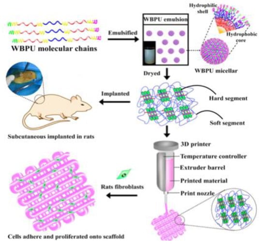 The self-assembled micellar structure of WBPU (PUDs) and the bioprinting process of WBPU by a self-developed platform (reproduced with permission from [86]).