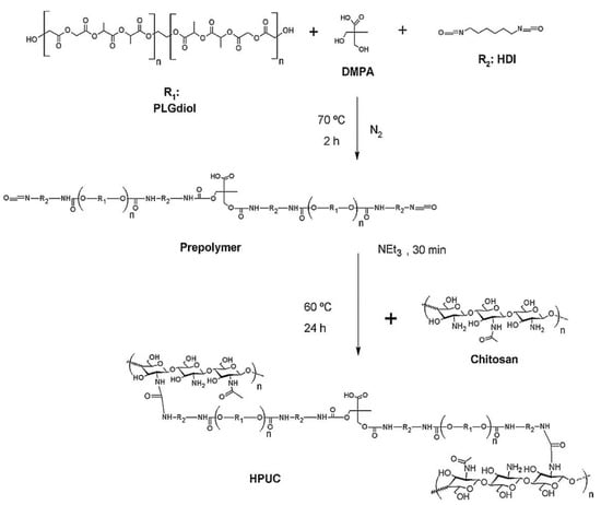 Waterborne dispersions of a chitosan-polyurethane hydrogel membrane (HPUC) with low cytotoxicity and improved wound healing abilities when used with mononuclear bone marrow fraction cells in a diabetic rat model, has been developed by Viezzer et al. [87]. The HPUC was constructed as a combination of chitosan blocks and biodegradable polyurethane. The authors claimed that the HPUCs have interesting properties that make them suitable for wound healing applications. The polyurethane prepolymers were synthesized from hexamethylene diisocyanate (HDI), DMPA, poly(lactide-co-glycolide) diol (PLGA diol), and triethylamine (TEA). Chitosan (0.01 g/mL) solution in 1.0% acetic was added dropwise to the polyurethane prepolymer solution under stirring at 70 °C to synthesize the HPUC. Figure 10 shows the elementary steps for the synthesis of HPUC. The HPUC1, HPUC2, and HPUC3 samples have 0.25, 0.5, and 0.75 g of PLGA-diol, respectively.