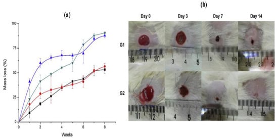(a) pure chitosan film (CHS) and HPUC mass loss curves after up to eight weeks: ◼ CHS, ● HPUC1, ▼HPUC2 and ▲HPUC3. All values are expressed as mean ± standard deviation (n = 3). (b) Representative image in the effects of HPUC1 and mononuclear bone marrow fraction isolation (BMMNCs) on wound healing in diabetic ulcer model. (A) Macroscopic observations in wound areas in the control (G1) and wound healing contraction induced by HPUC1 plus BMMNCs (G2) (adapted with permission from [87]).