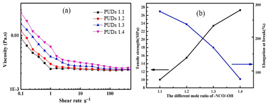 (a) shear rate dependence of PUDs viscosity at 25 °C for different R values. (b) Effect of R value on the tensile strength and elongation at break of different PU films (adapted with permission from [97]).